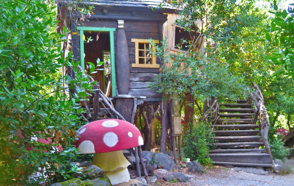 The Istrian Fantasy Forest is filled with fantasy-themed structures, including small wooden houses, oversized mushrooms, whimsical doors, and decorative figures inspired by fairy tales and folklore. At the same time, the space encourages interactive exploration, allowing children to imagine their own stories, invent characters, and move freely through the forest at their own pace.